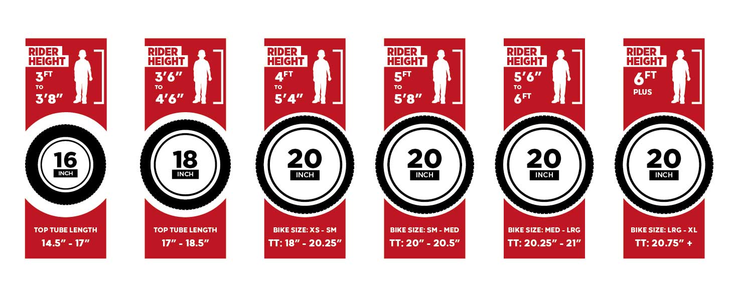 We have created an infographic below which will give you the information and measurements you will need to look out for depending on your height. You will also notice that there is some overlap with the measurements, as personal preference will be a factor with regards to what type of BMX Bike you should get.
