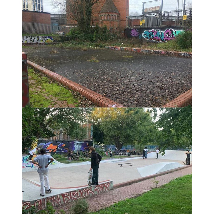 Local skater and resident Shaun Boyle felt driven to make a difference during the first lockdown. Shaun started clearing the bushes and waste and with other skaters, built a small skateable ledge. The project grew and Shaun was joined by many volunteers within the local skateboarding and resident community. The volunteers cleared the whole area to build various concrete skatepark features, re-digging verges, planting flowers and small trees, drawing on the expertise of a diverse user and resident community. Birmingham City Council initially expressed reservations about the skatepark's construction, but the volunteer team received backing from experienced skatepark construction experts. A skatepark project of this size and scale would’ve cost over £150,000 to build by a construction firm, but the project has been completed for just under £7,000, most of this crowdfunded, with some additional support provided by Skateboard GB and backed by Habito, Selco Building Supplies and Vans and in September 2021 Bournbrook was crowned the first-ever DIY park in the UK to be given formal skatepark status and officially opened to the public.