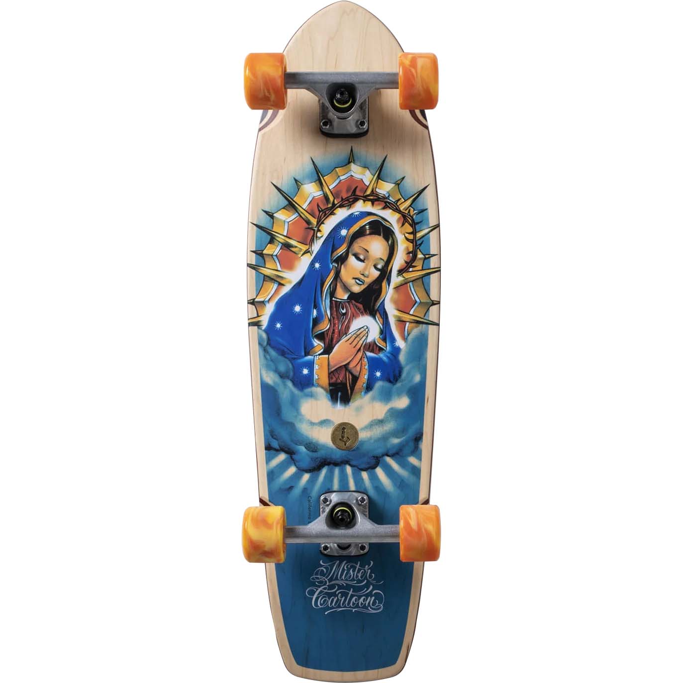 This cruiser is designed for smooth, surf-like rides with its low concave mould, soft 60mm 78A urethane wheels, and angled risers for effortless cruising. Built from 7-ply USA Hard Rock Maple, it features 5.25" Hollow Kingpin Ogre Trucks and Loco ABEC 7 bearings for durability and control. The board showcases an incredible Virgin of Guadalupe graphic by Mister Cartoon, seamlessly blending into the wood for a retro aesthetic, with a LOCOS metal badge and laser-etched signature for added detail. The anti-bubble grip tape ensures a clean finish, while the integrated bottle opener makes it session-ready. Perfect for a smooth and stylish ride across various surfaces.