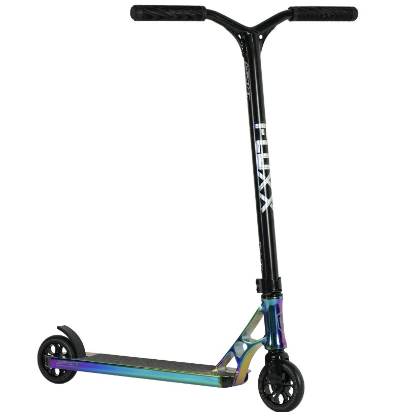 The Grit Fluxx is an excellent choice for riders transitioning from beginner to intermediate levels. It features a 4.8" wide aluminium deck, providing ample foot space for stability during tricks. The fully integrated headset and riser handlebars enhance control, while the nylon deck inserts add strength without extra weight. Equipped with 110mm alloy core wheels and a user-friendly HIC compression system, the Fluxx is designed for smooth performance in both street and park settings.