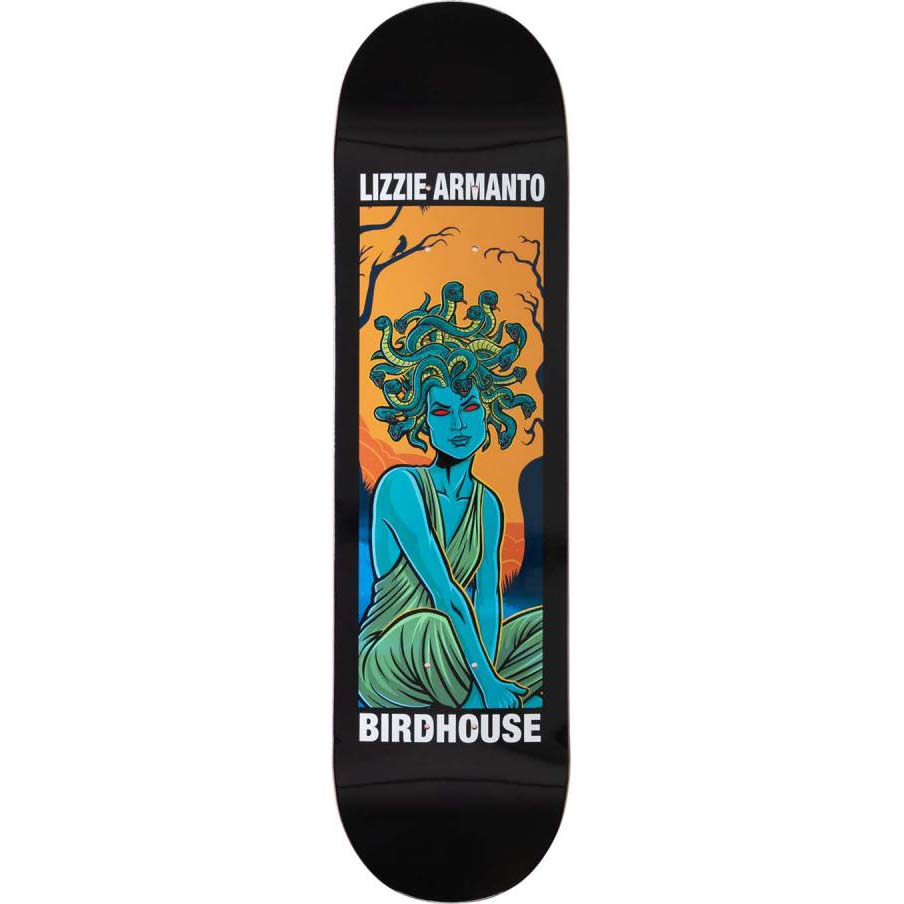 This Birdhouse deck comes with a classic 8.25" x 31.5" popsicle shape and a 14.25" wheelbase, perfect for all kinds of skating, from street to park. Part of the Second Life Series, this deck features Lizzie Armanto sporting a striking Medusa graphic with a top graphic and veneer stain. Made from durable 7-ply North American Hard Rock Maple, it’s pressed with epoxy for a responsive, poppy feel.