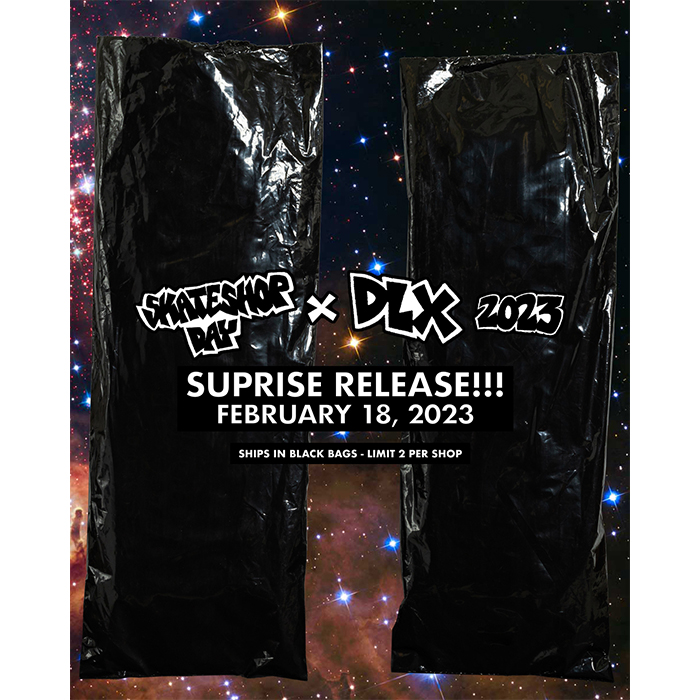This year Skate shop day collabed with DLX for limited edition boards. The decks come in 3 sizes but limited numbers. Also, we have 2 limited edition surprise decks in store for you to get your hands on. The surprise decks come in a black bag and will be first come first served when they are gone they are gone.