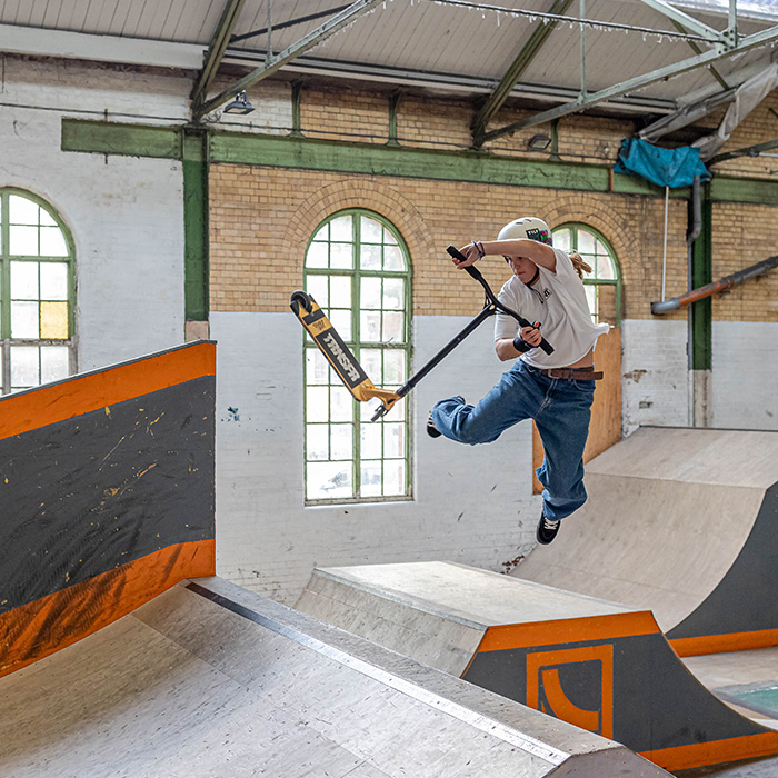 Jamie Hull started scootering at age 9. He said in a past interview, “I loved trying to learn new tricks, and although scooters weren't allowed in hardly any indoor skateparks, as soon as we could get to a park that would let them in, I really pushed myself to learn as much as I could in the little time we had. When Deeside Skatepark opened, I was just 10 years old, and it made all the difference. Although it didn't have any foam pits or resi ramps, just being able to ride in an indoor park was amazing. I really progressed my tricks, but not only that, I created some amazing friends. Without them and that park, I probably wouldn't be riding today.”