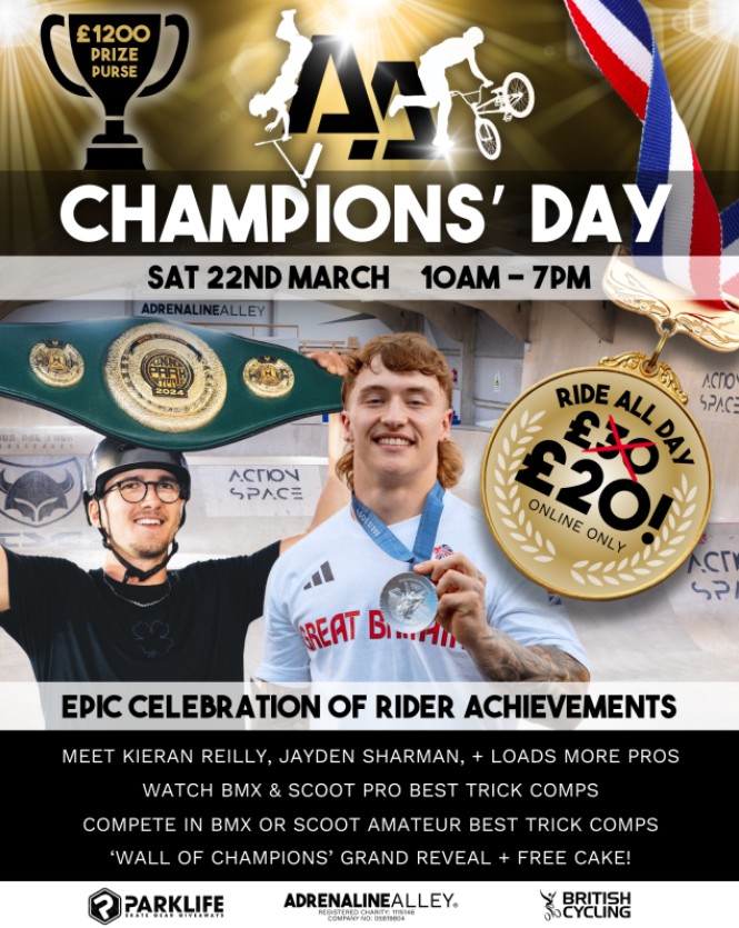 - An action-packed day honouring the legendary riders of Adrenaline Alley and their incredible achievements. Ride all day for just £20, meet top athletes like BMX Olympic silver medallist Kieran Reilly and Scooter World Champion Jayden Sharmen, and take part in Q&A sessions. Witness the unveiling of the brand-new Wall of Champions, and watch the Pro and Amateur Best Trick Competitions, with £1,000 and £100 prizes up for grabs. Plus, enjoy free cake to top off the celebration. This is an event you won’t want to miss!