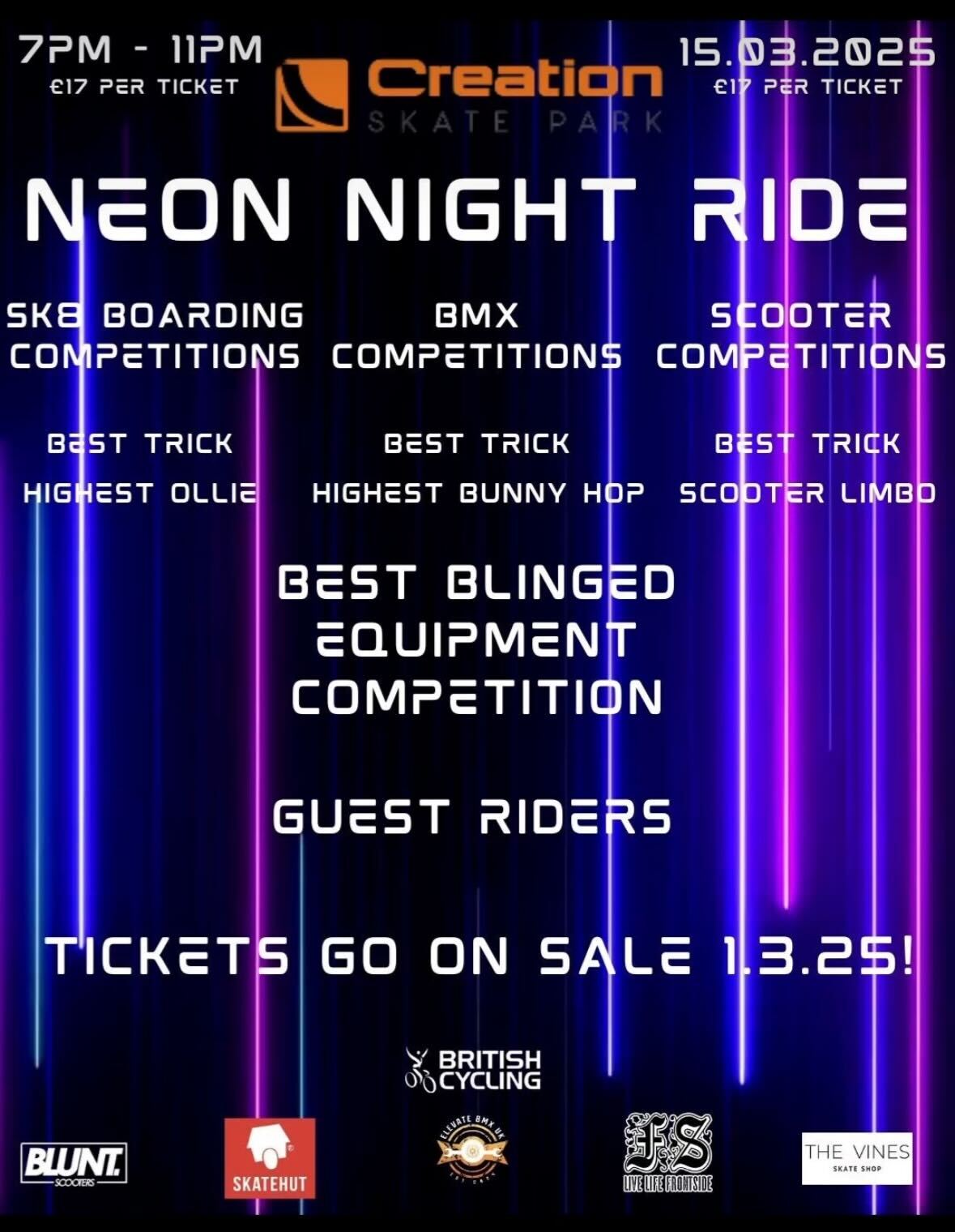 - Get ready for an electrifying UV night at Creations Skatepark! This high-energy event features skateboarding, BMX, and scooter competitions with awesome prizes up for grabs. Show off your style in the Best Blinged Equipment contest, and ride alongside special guest athletes. Whether you're competing or just soaking in the neon vibes, this is a night you won’t want to miss!