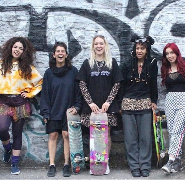 Takeiteasycrew located in and around London are a Women and non-binary skateboarding posse. They collaborate with londonskatemums and poserskateproject to hold girls and non-binary skate meet ups at revolution skatepark. This summer they have also held a skate trip to Barcelona.