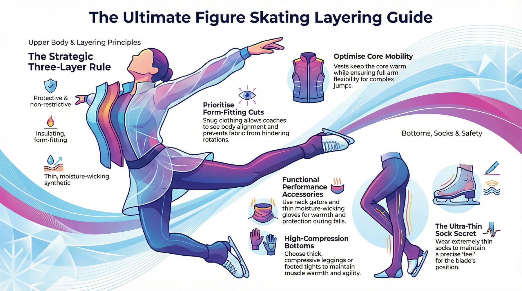 Accessories may seem like minor details, but they make a noticeable difference on the ice. Ultra-thin socks are essential for blade feel, as thick socks reduce precision in spins, edges, and footwork. Gloves protect hands from the cold and from impact during falls, with synthetic materials preferred for their lightweight, quick-drying properties. Neck gaiters are safer than scarves, as they won’t unravel or interfere with jumps and spins. Hats are usually unnecessary for indoor rinks and can easily fall off during practice.