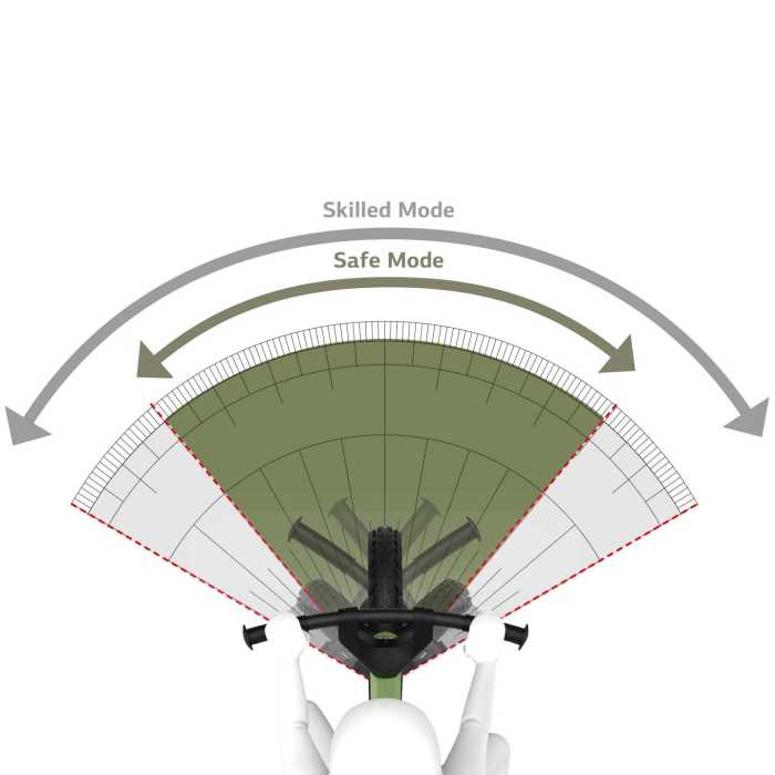 Safety is of course also paramount for you as an adventurer. Hence why all models come with a steering regulator with two positions: Safe mode for a safe start, and Skill mode to let rip. There are no sharp edges or protruding parts, and the footrests are integral to the design. This is safer for you and your Biky is less likely to get damaged.