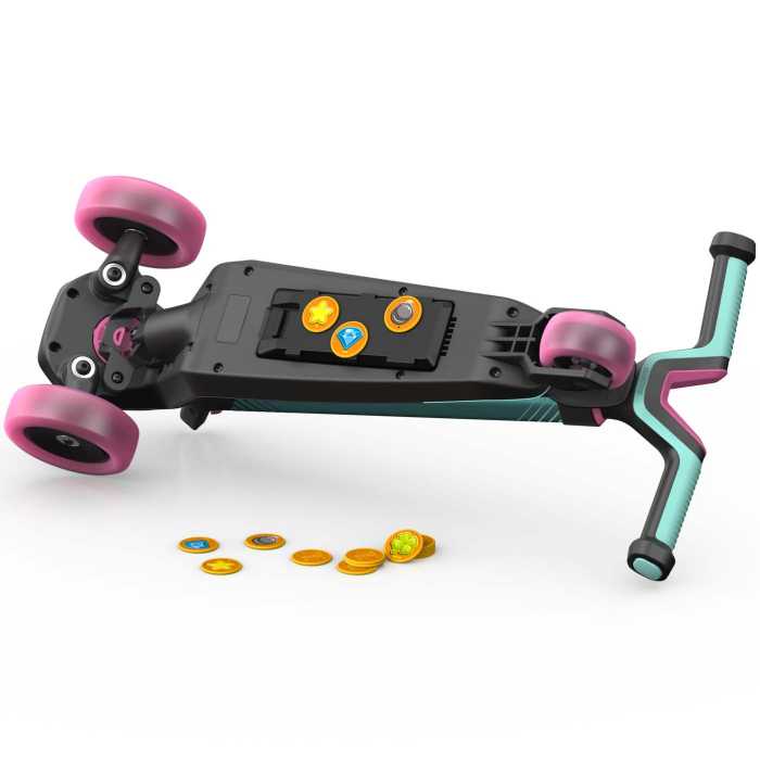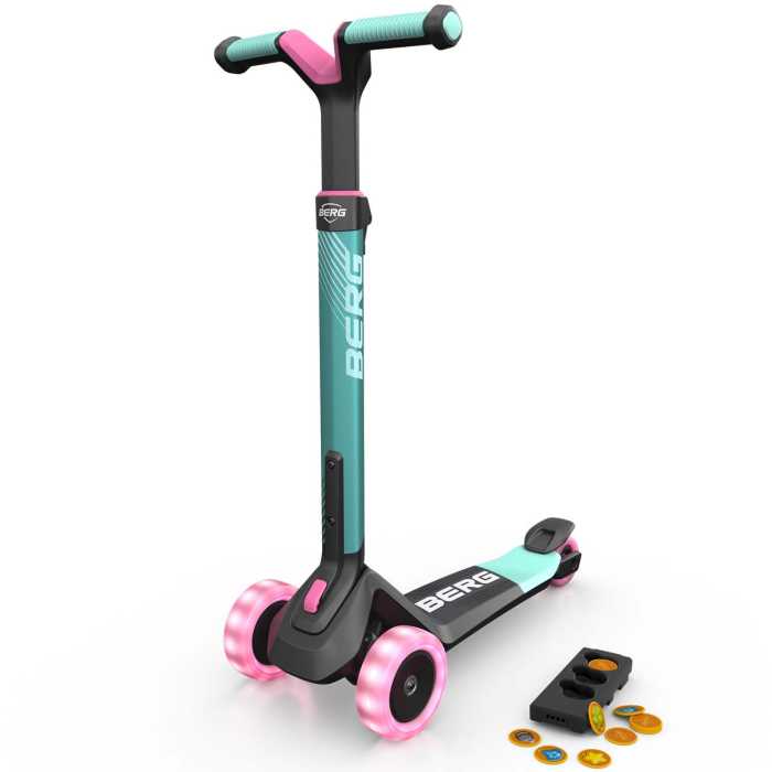 Your BERG Nexo comes complete with illuminated front wheels that flash as you ride (No Batteries Required). It also comes with the Nexo Magnet Add-on: ride the scooter over the metal discs to pick them up. The metal discs cling to the underside of the footplate like a magnet. The Magnet Add-on lets you turn scootering into a game of skill.