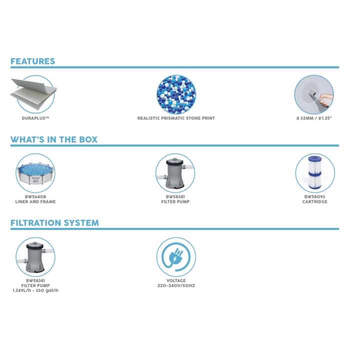 Setting up the Bestway Steel Frame Pro Pool is a breeze. The included setup instructions and user-friendly design allow you to assemble the pool quickly and easily without the need for any special tools. Simply lay out the pool liner, connect the steel frame pieces, and fill it with water. In no time, you'll be ready to jump in and start enjoying the crystal-clear waters.