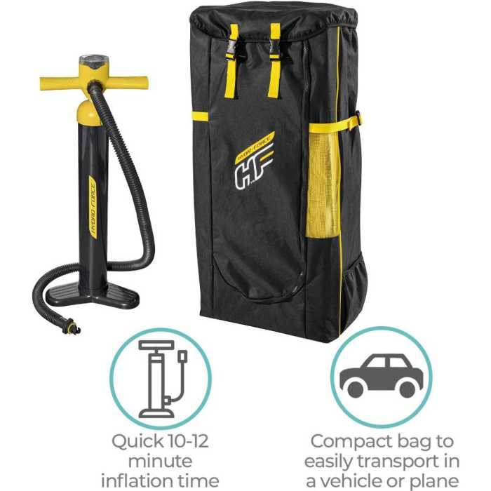 Hydro-Force™ Freesoul Tech Inflatable Stand Up Paddle Board Set includes stand up paddle board, deluxe backpack carry bag, hand pump, paddle, surf leash, seat with footrest, and repair kit.