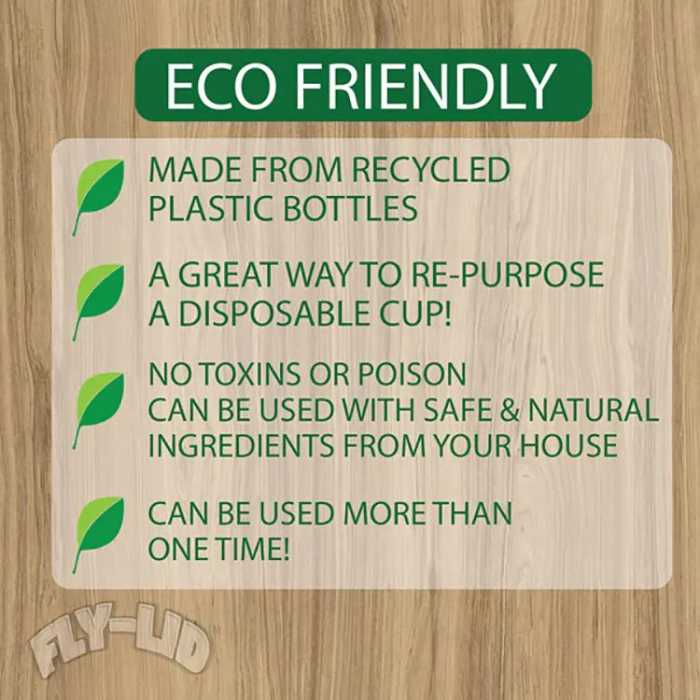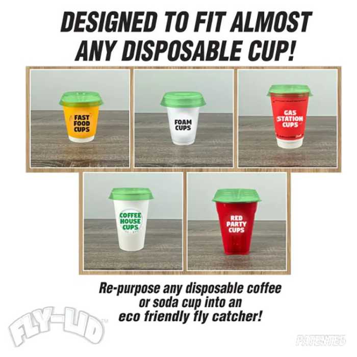 Turn any cup into a fly catching cup! Just add something sweet to a cup, pop the fly lid on top, and you are ready to catch some flies! No need to use poisons or messy sticky traps to rid your house of flies. With the Fly Lid, you can use safe and natural ingredients from your own home. You can repurpose a used disposable cup or you can use a cup from your cabinet. The patented tiered design allows the Fly-Lid to fit on most cup!