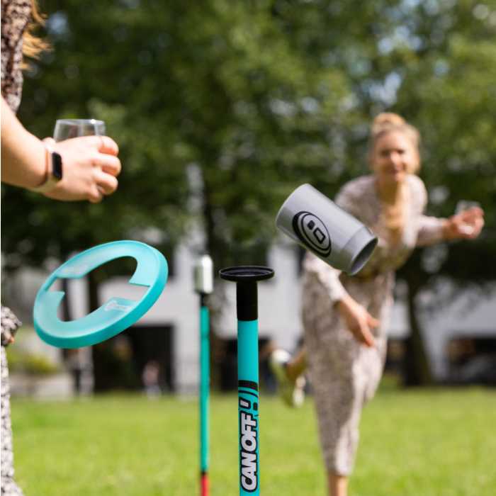 The Canoff game is played by throwing the disc and knocking the other teams can off a pole. The first team to ten points wins!