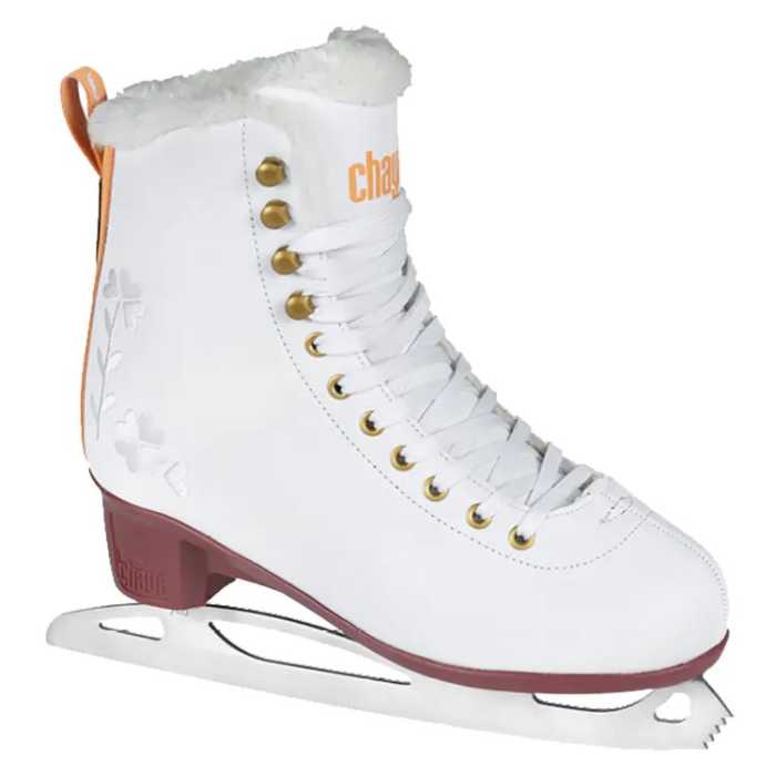 The Chaya Snowfall ice skate is a beauty. The combinatino of the classic cream boot with the bronze-colored eyelets and silvery embroidery gives this skate a classic but modern look. This high-quality performance ice skate is made of the best materials out there. The cold-resistant vinyl exterior and cozy faux fur interior will keep your feet warm on a long ice trail. Anatomically-shaped padding provides ultimate comfort and a superior heel lock. This fashionable, vegan ice skate is designed with both beginners and advanced ice skaters in mind. Mounted on the Chaya Diamond ice blade; a stylish pre-sharpened, rustproof blade which provides a smooth stride and an outstanding look. Lace these beauties and enjoy the ride!