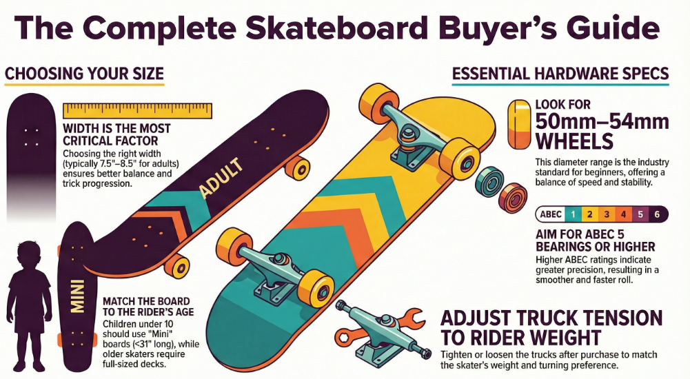 When purchasing a complete skateboard, it's important to consider various factors such as deck size, trucks, and bearings. However, wheel size and durometer may not be a primary concern for beginners. Most complete skateboards come with wheels that fall between the range of 50mm and 54mm and a durometer rating of 97A to 99A.