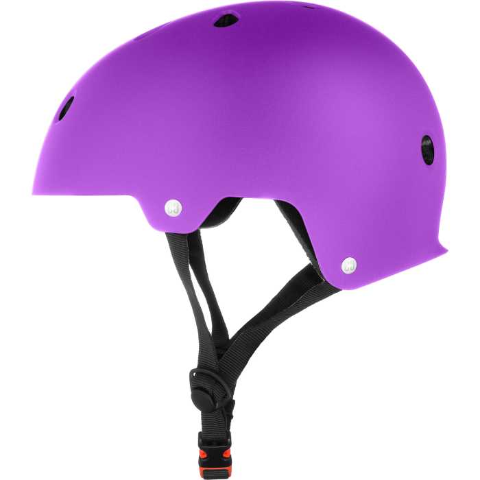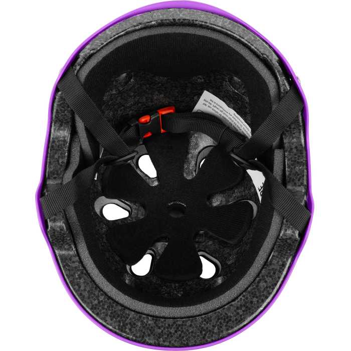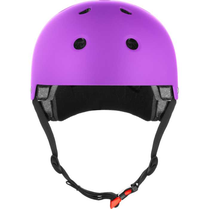 A 3-point durable nylon strap with size adjustable chin straps has a red safety buckle and coupes with the classic low profile skate helmet design for a secure fit.