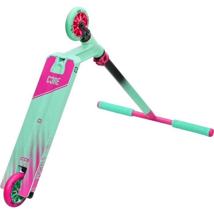 The scooter features a durable and lightweight aluminium frame, as well as sturdy metal core wheels for smooth and stable ride. The deck is covered with premium grip tape for added control and traction, and features a boxed end design, making it easy to learn grinds. The scooter also has a head tube cut out for added style, and comes with CORE's super soft TPR handlebar grips for a comfortable and secure grip.