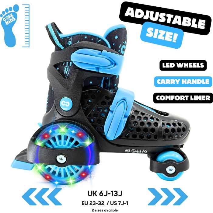 With a safe, sturdy, and adjustable design, the CORE Kids Newbie 4-Wheel Adjustable Skate is the ideal choice for young skaters stepping into the world of skating for the first time!