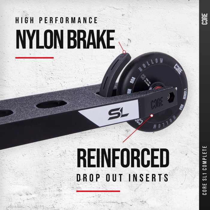 SL1 decks also feature a CORE Dual Scooter Brake which is made from a super-strong Nylon material that covers the brakes metal skeleton for extra strength. Compatible with both 110mm and 120mm wheels using our unique rockered bolt design. You can quickly and easily change your brake to fit your scooter wheel size with just one bolt.