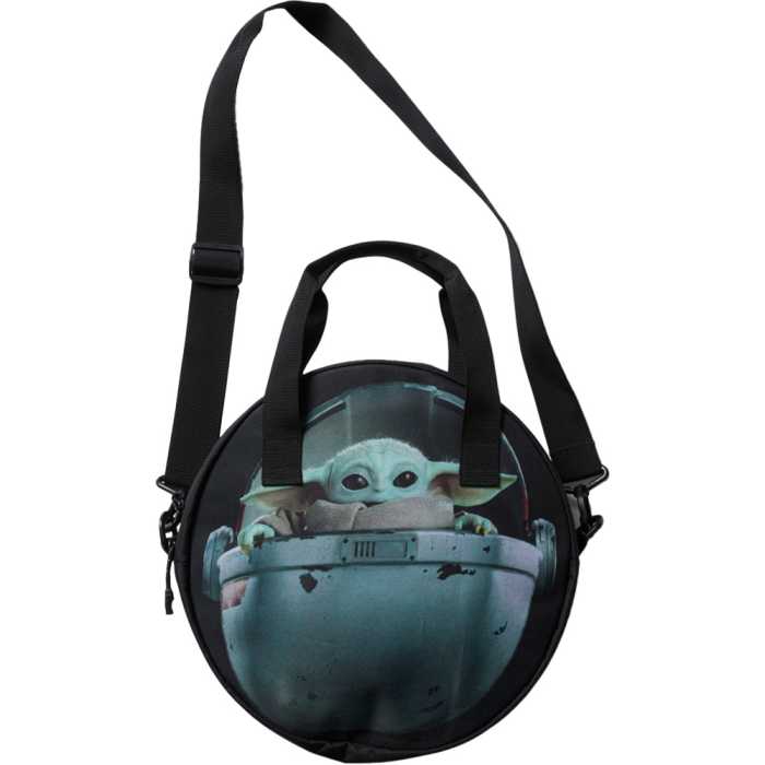 Round Shoulder Bag Top Opening With Metal Zip Closure 1.5" Wide Removable Shoulder Strap 1.25" Wide Carry Handle Straps Sublimated Print On Front Interior Slip Pocket DC X Mandalorian Officially Licensed Material