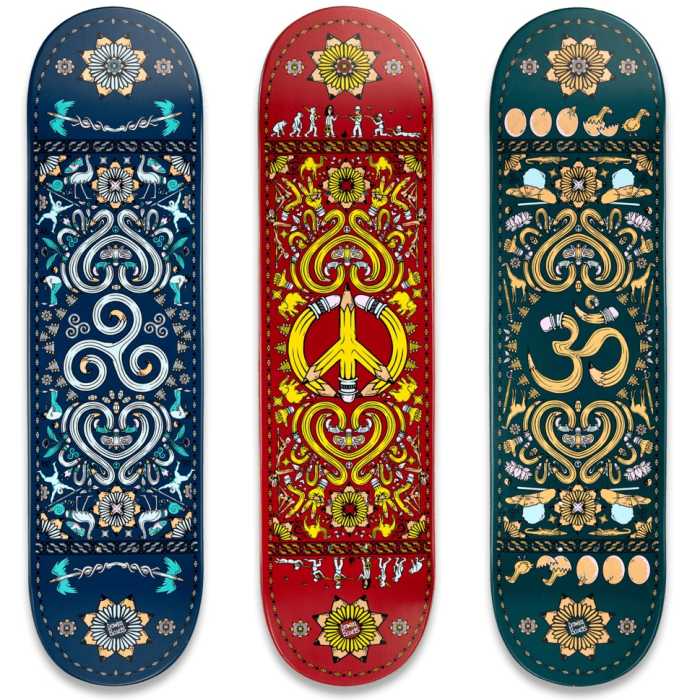 Get in touch with your skateboarding spirit with Drawing Boards Positive Patterns series. Depicting an OM symbol surrounded by complimentary characters and artwork, be one with the sound and vibration of the universe. Wake skateboard, Sleep skateboard, Dream skateboard with this metaphysical maple deck from Drawing Board.