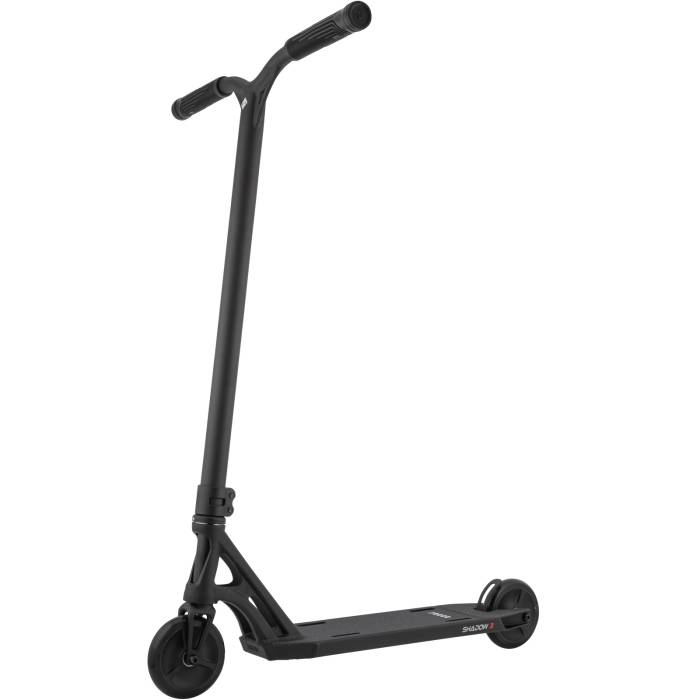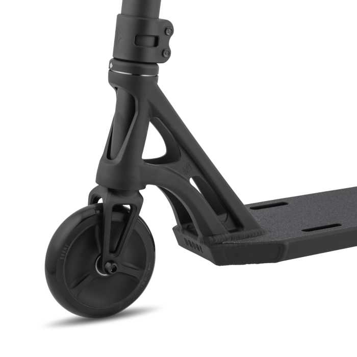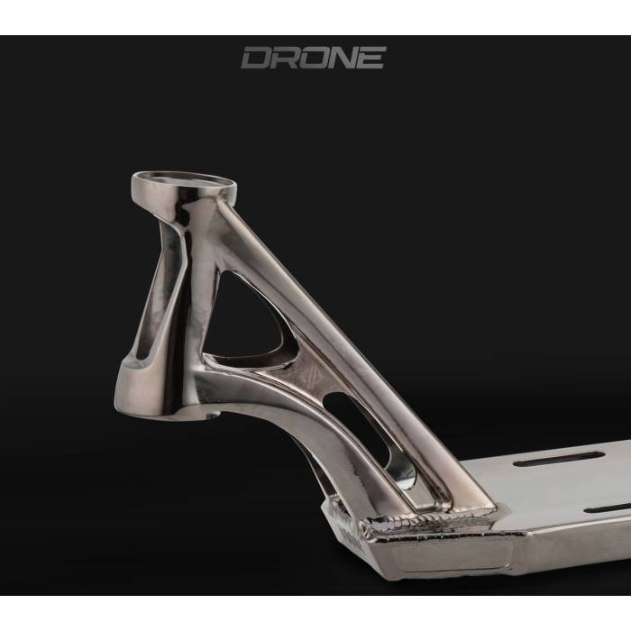 The deck itself weighs in at just 1.2kg, bringing the complete down to an astonishing 3.15 kilograms. The Shadow 3 is a true performance product, sporting the all-new Helios Hollow-Spoked Wheels. These wheels have an optimised core to PU ratio which reduces weight, increases rigidity and maximises power transfer for maximum speed. The wheels themselves rotate around Drone's all new Ultra-Sonix bearings which boast unparalleled speed. The forks have been meticulously refined, cutting as much excess weight off them as possible to create a minimalist, lightweight design which improves the level of control and overall performance of the scooter. Aesthetically the deck now has top and bottom cut-outs that have been positioned to reduce weight even further without compromising the strength. The extrusion has been perfectly tapered to maximise foot space and reduce unnecessary weight.