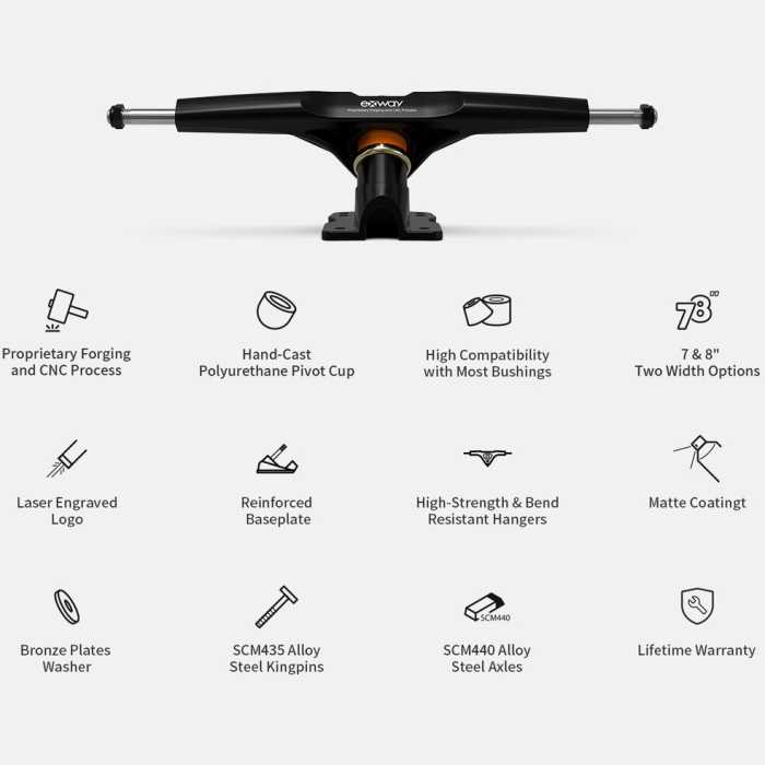 The all-new Trist truck utilizes a Proprietary Forging and CNC Milling Manufacturing Process developed by Exway Engineering Team for improved strength compared with traditional die-cast trucks.