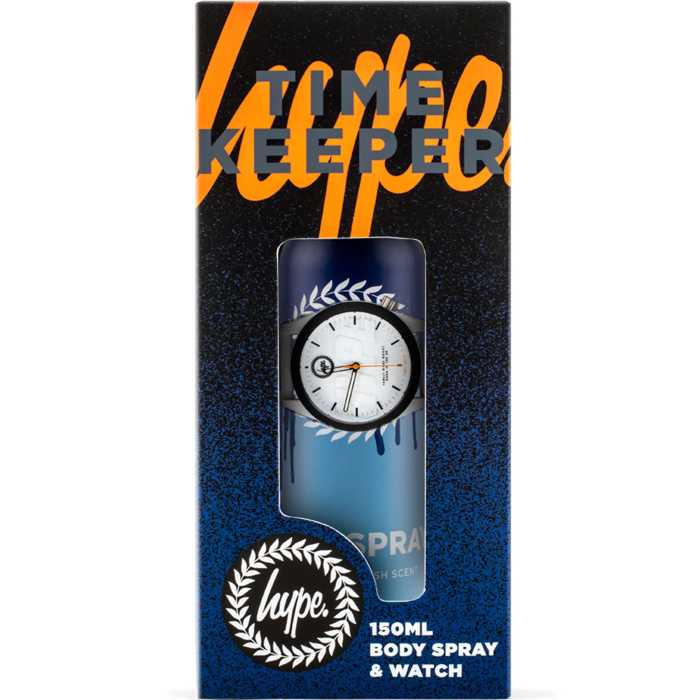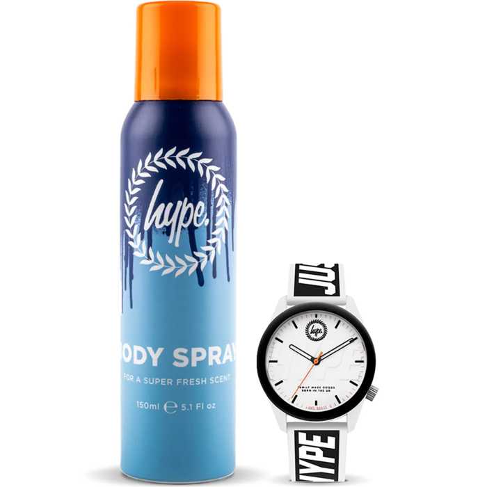 HYPE. Watch 150ml Body Spray Just Hype Detail On Watch Strap Hype Logo Details Keep time while smelling fine with the HYPE. Watch and Body Spray Set. In need of the perfect arm candy? Want a new spray? We've got you covered with this 2-in-1 gift set.