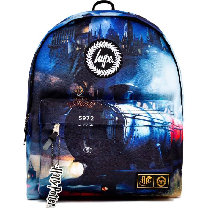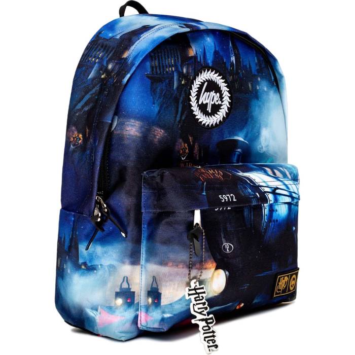 All aboard! The HYPE. X Harry Potter Hogwarts Express Backpack features an all-over Hogwarts Express print in a blue, black, and gold colour palette. Made from 100% polyester in our standard backpack shape. Finished with a grab handle, front pocket, comfortable over-the-shoulder straps, a Harry Potter keychain, and the iconic HYPE. crest logo.