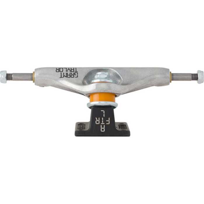 Independent Trucks Grant Taylor Pro Stage 11 Hollow features polished silver hanger with GT pad prints front and back, flat black powder coated baseplate with laser etched logo on rear kingpin housing, classic orange cushions, and silver hardware.