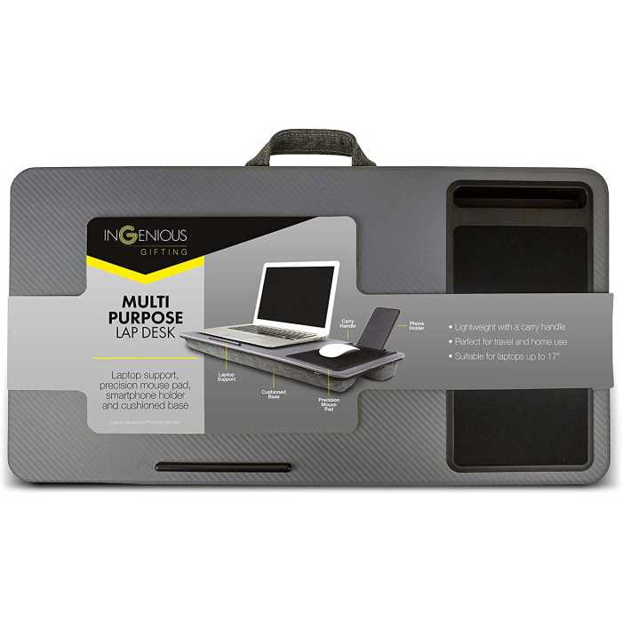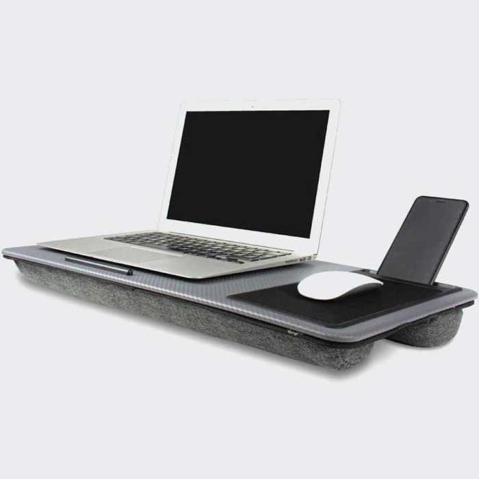 It also includes some very handy added features such as its cushioned base for protecting your legs from a heavy (or at least uncomfortable) laptop, a slot for your phone (or external hard drive) and a carry handle for when you're on the move.