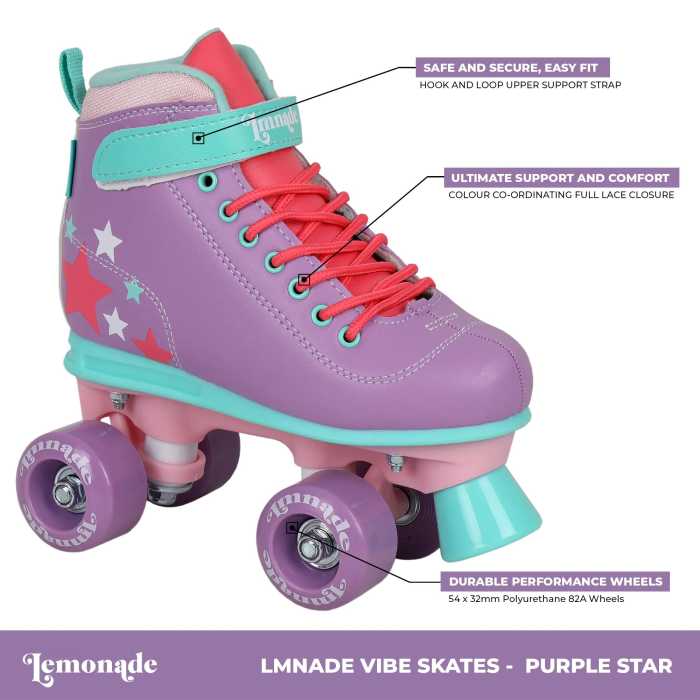 A classic recreational rollerskate design with a semi-soft vinyl boot offering the perfect balance of support and comfort, ideal for indoor or outdoor use. Now available in several stylish and eye catching colour options with LMNADE detail, you will be the one that gets noticed and stand out from the crowd.