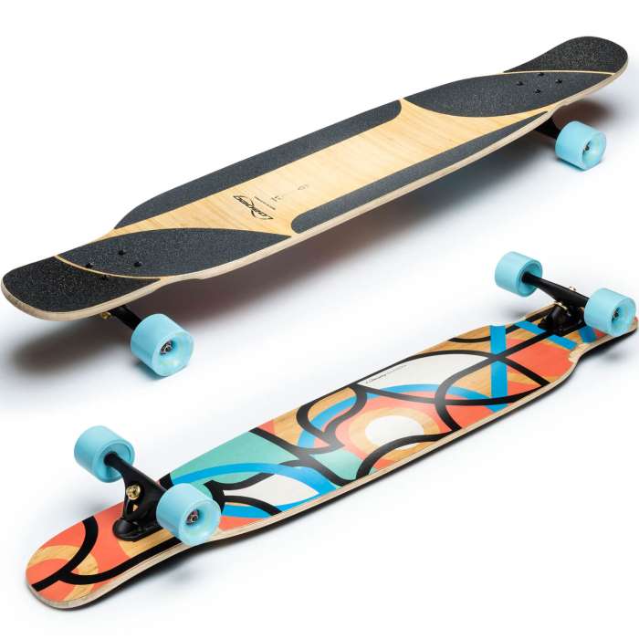 The Bhangra V2 features original artwork by Mexican artist Tomas Guereña (a.k.a. “screw”), the same artist who designed the Poke graphic. The lines of the graphic are meant to symbolize the movement and flow of longboard dancers.
