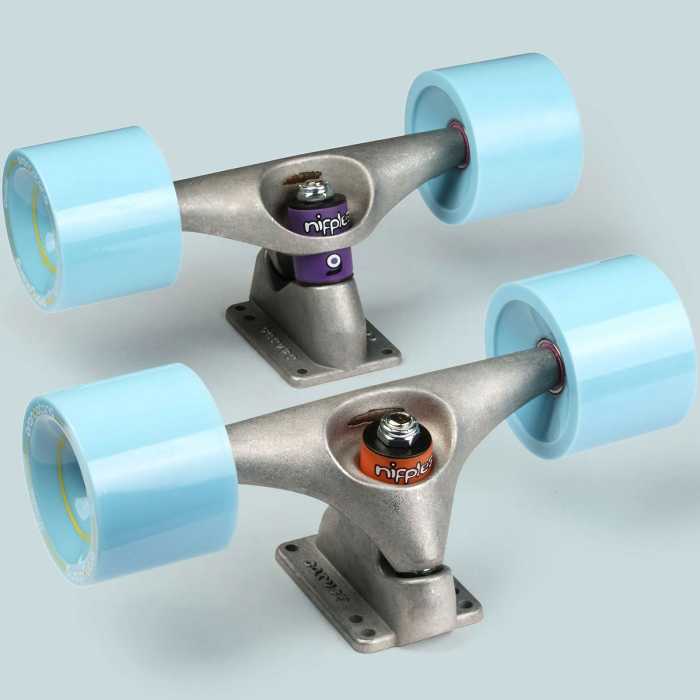 Loaded retrofit the CX truck set with super-high-rebound Orangatang Nipple bushings (orange/soft front and purple/medium rear) for even more power and drive. Paired with 70mm blue (extra soft, 77a) Orangatang 4President grippy wheels, this is a great all-around setup that can handle faster surf skating and slashy gravel sprays.