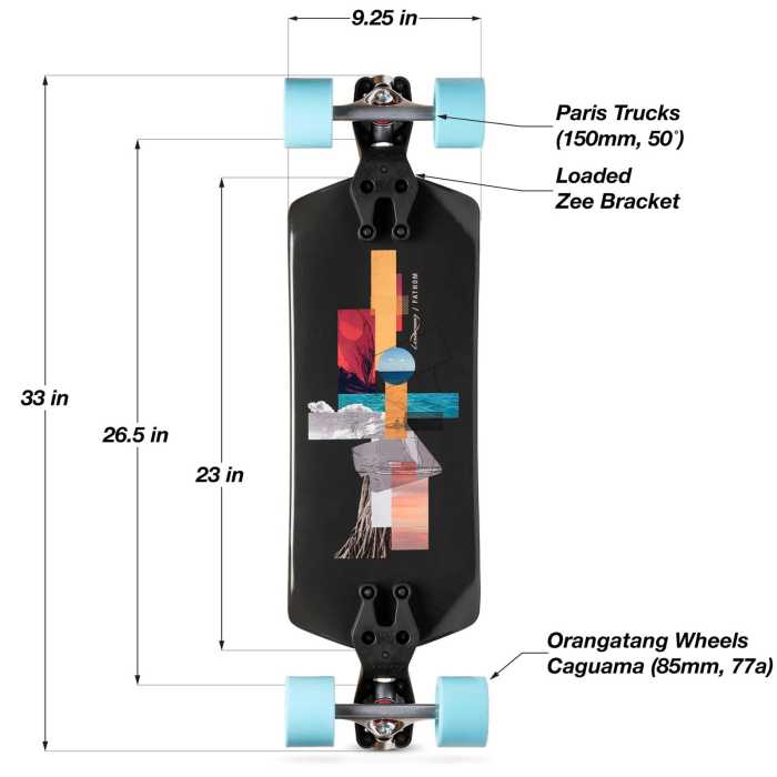 1. Paris 150mm trucks and 105mm Dad Bod wheels (80a orange). This setup is a blast to ride, carries massive momentum, and can go over anything for easy cruising. (Here at Loaded we vastly prefer to ride this setup because of its epic rollover power.)