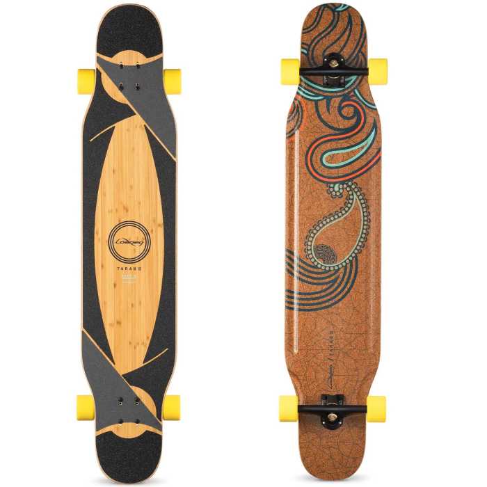 Available in two distinct flexes. Flex 1 features a thicker bamboo top veneer for added stiffness and damping. Flex 2 is slightly lighter and noticeably more lively. Both flexes feature two updated wheelbase options to accommodate a variety of riding preferences (the new outer setting is equivalent to the previous inner setting on the original Tarab).