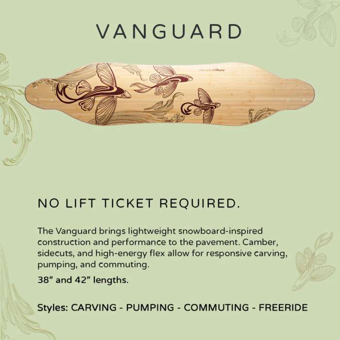 Snowboard Style Freeriding at its Finest! The Vanguard longboard from Loaded brings lightweight snowboard-inspired construction and performance to the pavement. Camber, sidecuts, and high-energy flex allow for responsive carving, pumping, and commuting.