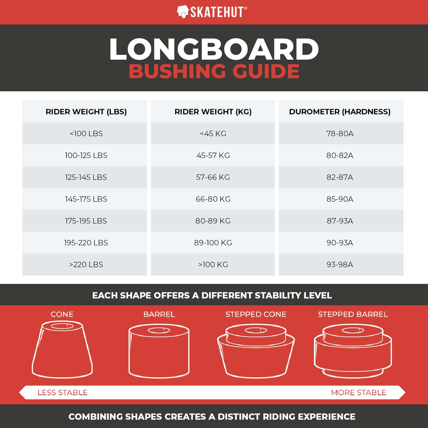 When determining the appropriate durometer for your longboard bushings, it's essential to consider both your weight range and riding style. Soft bushings, ranging from 78a to 83a, offer greater responsiveness but may sacrifice stability, while harder bushings (91-98a) prioritize stability over responsiveness. Your weight range should guide your initial selection, but adjustments may be necessary based on your riding speed and style. For fast freeride or downhill speeds, opting for a slightly harder durometer or a more restrictive bushing shape can enhance stability. Conversely, for transportation or carving, choosing a slightly softer durometer or a less restrictive bushing shape can promote a more playful and responsive feel.Additionally, split durometer bushing setups allow for further customization. Combining a harder boardside bushing with a slightly softer roadside bushing provides a stable base while maintaining responsiveness, catering to various riding preferences and styles. Experimenting with different durometers and setups can help you find the ideal combination for your longboarding experience.