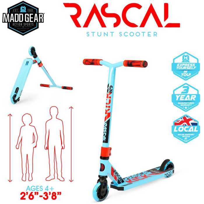 The Madd Gear Kick Rascal IV Stunt Scooter is designed specifically with the younger rider in mind. With a shorter deck and lower bars, the Kick Rascal is perfectly balanced and effortless to control for riders 4 years and up.