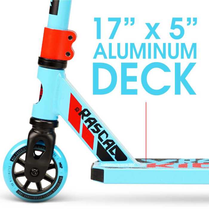The Madd Gear Kick Rascal Stunt Scooter now has a 5" deck which is an inch wider than previous models. This makes for a more comfortable ride, and a bigger landing platform, meaning more tricks.