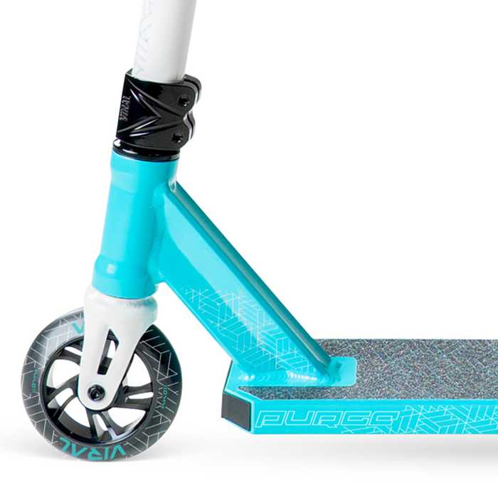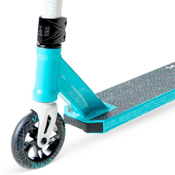 Designed with a compact 4.5" (114mm) width alloy deck, 110mm alloy core wheels, and a 24" (610mm) x 22" (559mm) low-rise T-bar, the VIRAL PURGE PRO scooter offers a balanced geometry for both street or park riding. The high-speed ABEC 11 bearings keep you rolling smoothly while the integrated sealed headset and IHC steel fork help deliver the responsiveness needed for grinds, whips, and manuals.