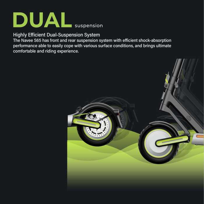 With a high-efficiency front and rear suspension system, there's no need to worry about those bumps and cracks in your way while riding in comfort with the Navee S65.