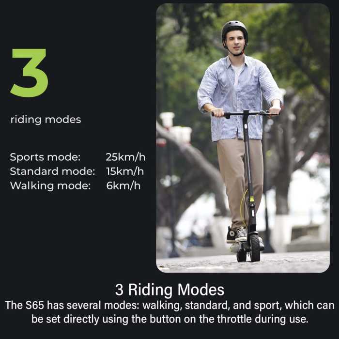 The NAVEE S65 scooter has three riding modes, which offer different speeds ranging from 15km/h to 25km/h. This feature allows riders to choose the right speed according to their comfort level and riding.