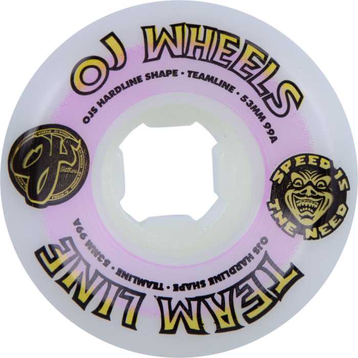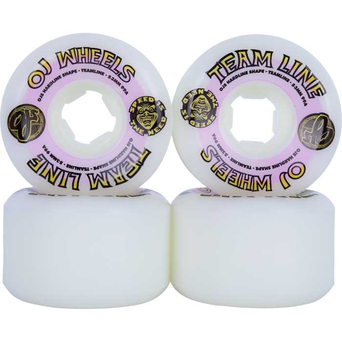 OJ Wheels Team Line Hardline wheels with classic inspired graphics and Team Line 99a urethane in a natural white colour.