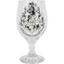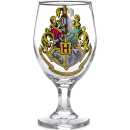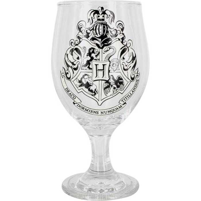 The themed glass features the iconic Hogwarts crest, including the symbols of each of the four school houses: Gryffindor, Hufflepuff, Ravenclaw, and Slytherin; The crest also features the famous school motto - 'Draco dormiens nunquam titillandus' (Never Tickle a Sleeping Dragon).