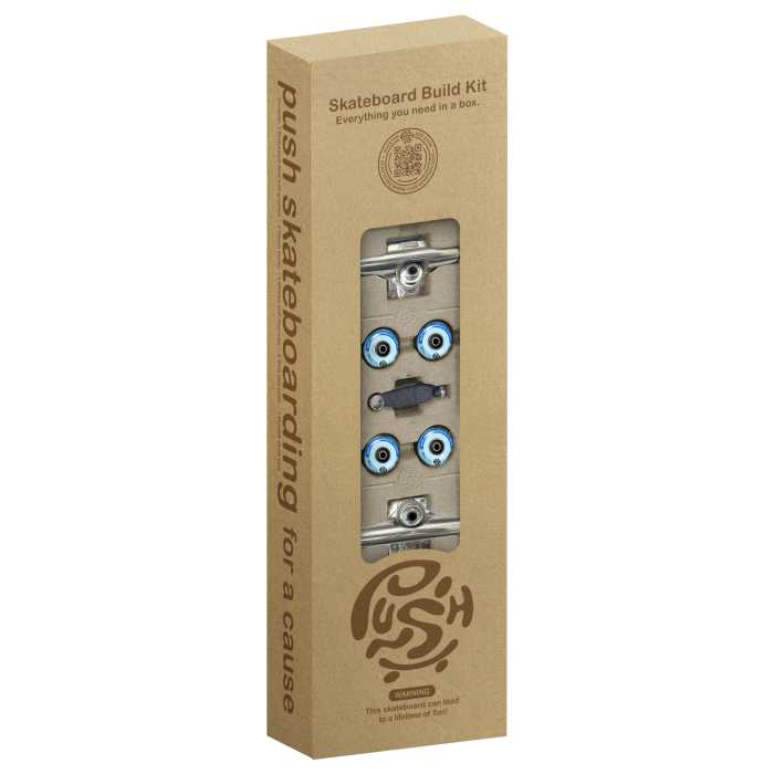 Specifically designed with starters in mind the First Push Incomplete build-your-own skateboard kit has been curated to give you the best start on your skate journey. This set includes all the parts you need to build your own board and is presented in a gift box.
