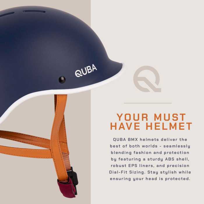 QUBA BMX helmets deliver the best of both worlds - seamlessly blending fashion and protection by featuring a sturdy ABS shell, robust EPS liners, and precision Dial-Fit Sizing. Stay stylish while ensuring your head is protected.