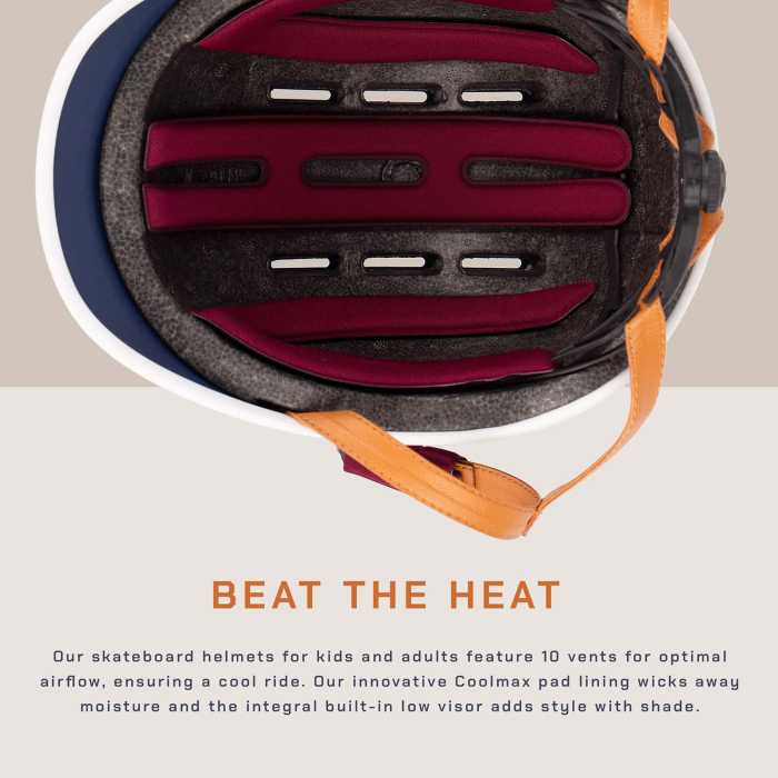Our skateboard helmets for kids and adults feature 10 vents for optimal airflow, ensuring a cool ride. Our innovative COOLMAX® pad lining wicks away moisture and the integral built-in low visor adds style with shade.