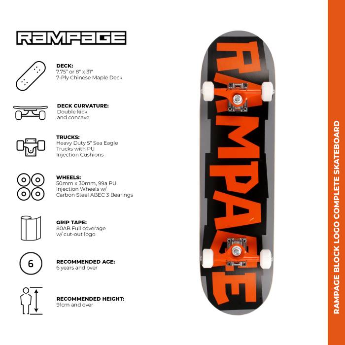 Rampage's notoriously sick graphics and full coverage cut-out logo grip tape finish this 'Block Logo' Series off rather nicely. It's sure to turn heads at the park.