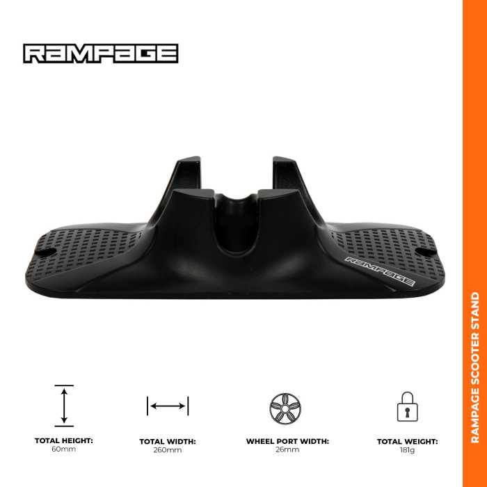 Keep your scooter stood up and looking presentable with this brand new scooter stand from Rampage! This durable Scooter & Stunt Scooter Stand is made from super tough ABS and is the perfect design to fit all scooters fitted with 95mm to 125mm diameterwheels. Keeps your scooter upright, with no more leaning precariously against a wall or lying on the ground ensuring your scooter stays in tip top condition. The Rampage scooter stand holds you scooter securely with no tip-over and comes with two optional mounting holes in the design, just in case you wish to secure to the ground.